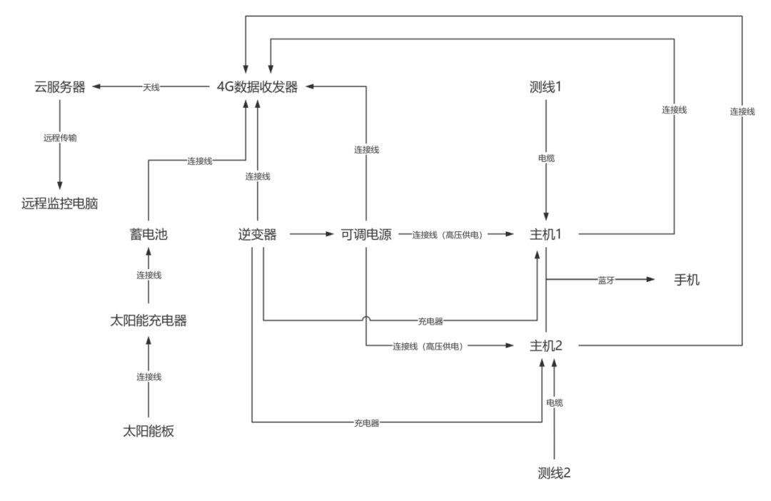 在普通高密度电法测量方法和仪器的基础上,增加太阳能发电装置、蓄电池、天线等模块以实现对现场测量的实时远程监控,不间断地采集数据,从而更清晰、连续的观察到采集点的数据变化过程。