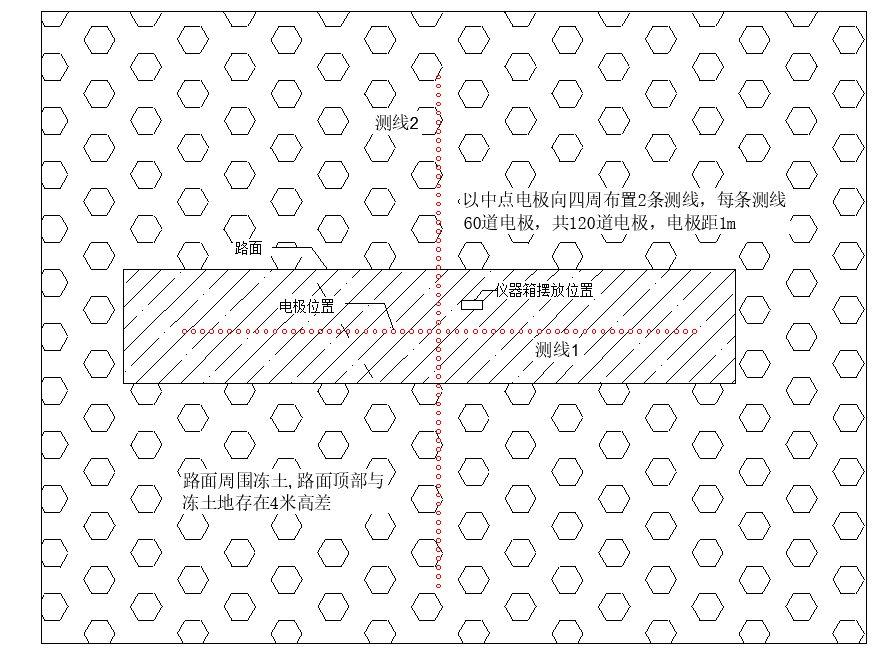 现场情况:测线布置在其自建的实验路面上,路长200米,路宽6米,表面覆土,土面之下为路基,路基为小块碎石,路面高度4米,路面之下为高原冻土,冻土较硬,杂草较少。根据现场情况,本次实验项目一共设计测线2条,每条60道电极,电极距1米。测线1平行于路面铺设,测线2垂直于路面铺设(如图4)。