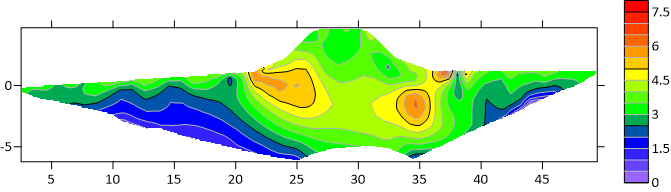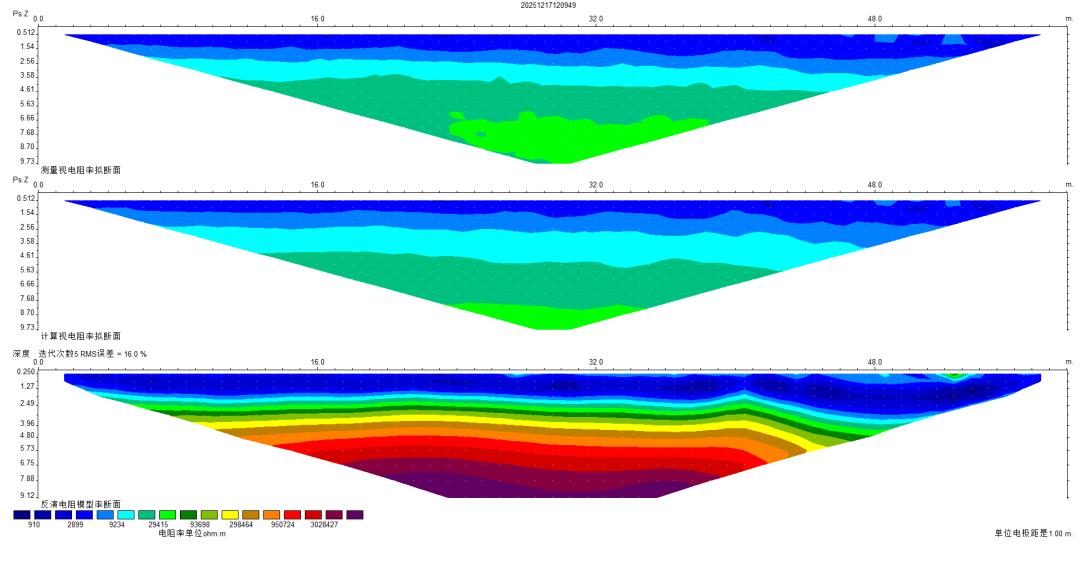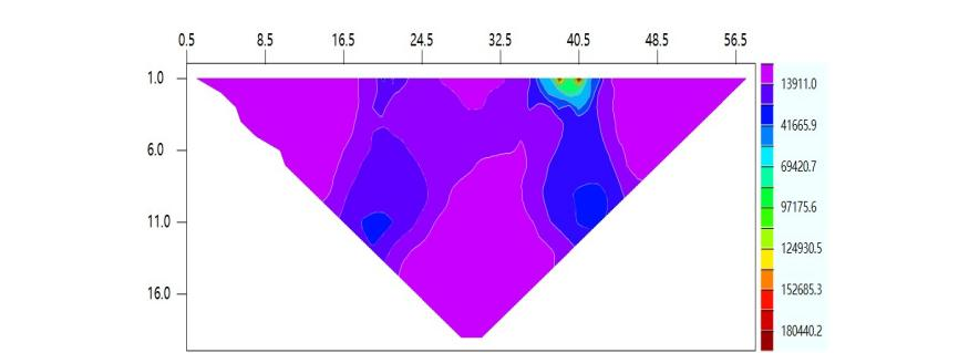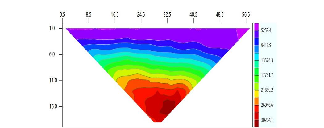 原始数据量记录成图采用surfer软件对原始数据进行网格化处理,并且采用彩虹色标生成等值线图,用瑞典2维反演软件res2dinv进行反演,得到反演成果图。以下为测线1(如图6)和测线2(如图7)的成果图。